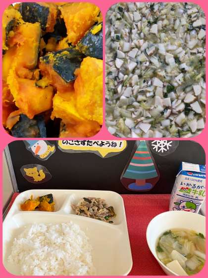 今日の給食献立は、『豚肉と干しずいきのみそ煮、うすくず汁、焼きかぼちゃの甘みつかけ、ごはん、牛乳』でした。