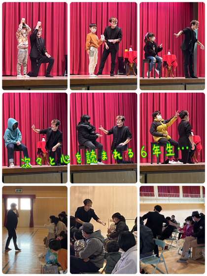 マジシャンちゃっぴーさんによる素晴らしいマジックの数々。子どもたちもマジックにたくさん参加していました。サイコロマジックでは6年生が次々と心を読まれサイコロの目を当てられていました。すごい!ちゃっぴーさんのメンタリストとしての力も見せてもらいました。
