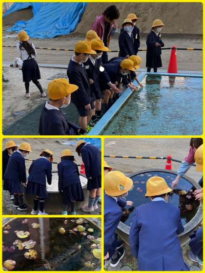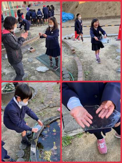 今日は一段と寒く感じた朝。登校してくる子どもたちも寒そうです。職員室前のメダカ池は…やっぱり凍ってる!!ということで早速立派な教材になりました。