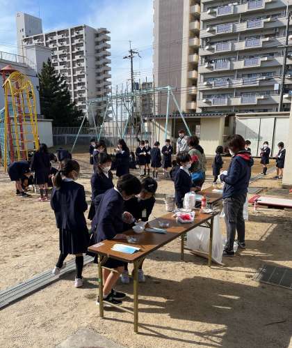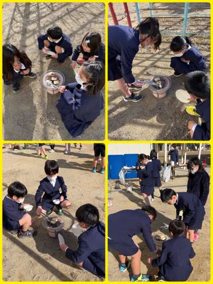 3年生社会科の学習の一環として、「七輪を使ってお餅を焼こう」を行いました。昔の道具やそれらを使っていたころの暮らしの様子を調べることを通して,当時の人々の生活との違いや変化、人々の生活の知恵を考えることができるようにすることがねらいです。