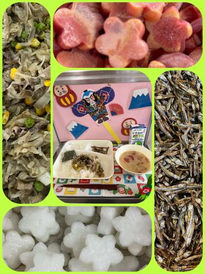 今日の給食献立は、正月の行事献立!『きんぴらちらし、ぞう煮、ごまめ、ごはん、牛乳』でした。