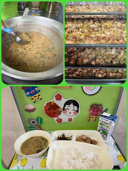 今日の給食献立は、『まぐろの甘辛焼き、豚汁、くきわかめのつくだ煮、ごはん、牛乳』でした。