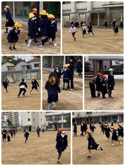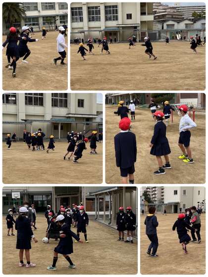 お昼休みの運動場。今日も元気な子どもたち、そしてたくさんの先生たちも。うれしい光景です。よく見ると、なんだか先生たちの方がはしゃいでいるような…。
