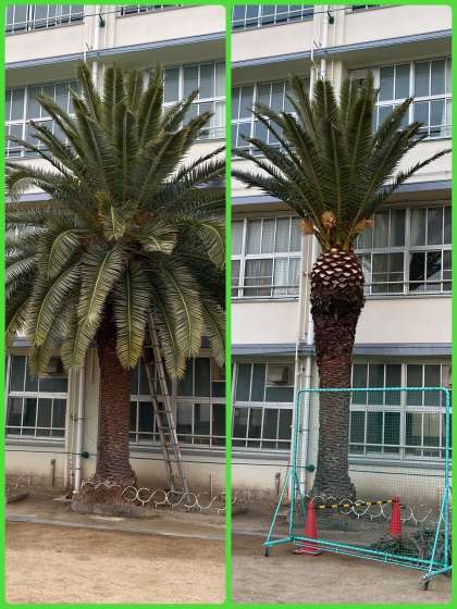 万が一、枝が落ちて子どもたちがケガをするようなことのないよう、本校、そして他校の管理作業員さんにもお手伝いいただき、大きなソテツを剪定しました。ありがとうございます!これで安心安心。このソテツの枝や葉がどんなふうに、また伸びていくのか見ておいてね。