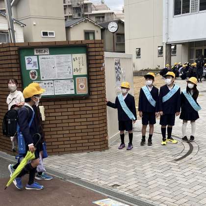 今日からあいさつ隊は3年2組のみなさんです。4名が来てくれました。4年生の学級代表のみなさんと一緒にがんばってくれたおかげで、今日も元気な朝になりました。ありがとう!