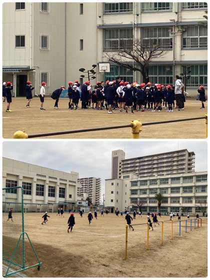 休み時間、2年生と4年生が一緒に「ふえおに」をして遊びました。楽しく遊ぶ子どもたち。あちらこちらに笑顔があふれていました。