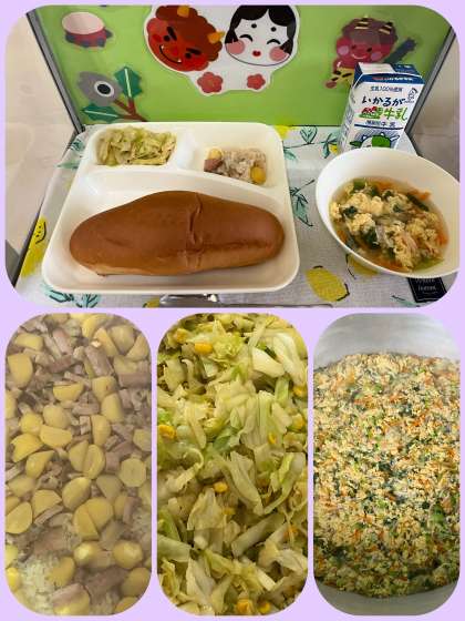 今日の給食献立は、『中華おこわ、卵スープ、キャベツのオイスターソースいため、黒糖パン、牛乳』でした。