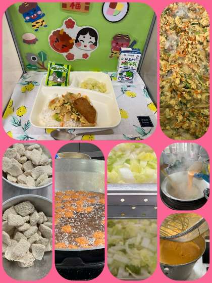 今日の給食献立は、『カツ丼、はくさいの甘酢あえ、まっ茶大豆、牛乳』でした。