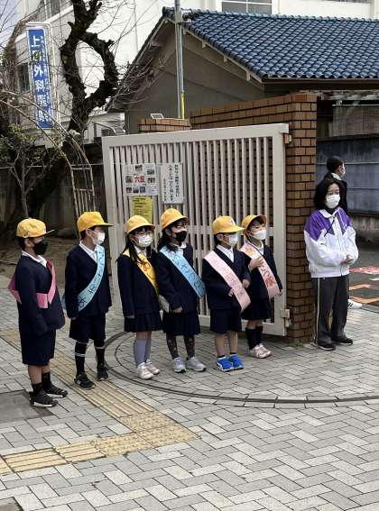 今日からあいさつ隊は1年2組。6人が来てくれました。どんどんズレていくタスキを直しながら、かわいらしい声であいさつをしてくれました。すばらしい!