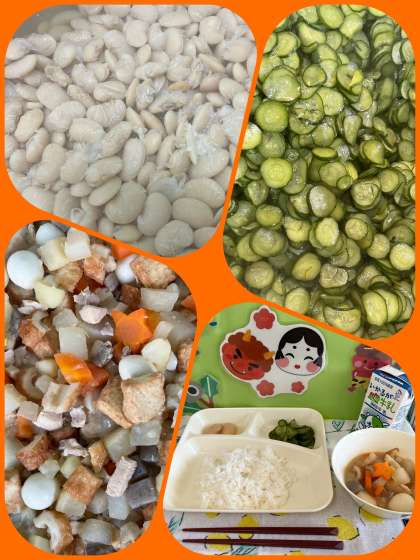 今日の給食献立は、『関東煮、きゅうりの梅風味、白花豆の煮もの、ごはん、牛乳』でした。