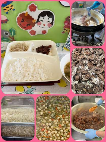 今日の給食献立は、『くじらのオーロラ煮、まる天と野菜のうま煮、もやしのピリ辛あえ、ごはん、牛乳』でした。