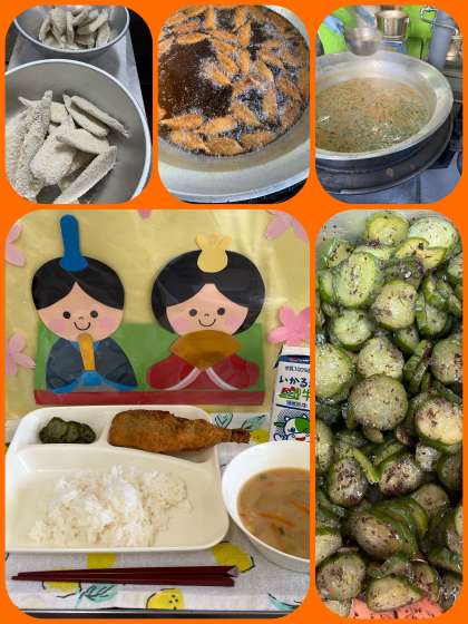 今日の給食献立は、『いわしフライ、みそ汁、きゅうりの赤じそあえ、ごはん、牛乳』でした。