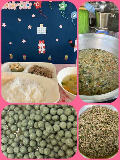 きな粉よもぎだんこは、焼き物機で蒸しただんごにみつをからませ、喫食時にきな粉をまぶして食べます。春を感じる給食献立の一つです。豚肉と野菜のいためものは、しょうが汁で下味をつけた豚肉ともやし、さんどまめを炒めたものです。味がしっかりついていておいしかったです。