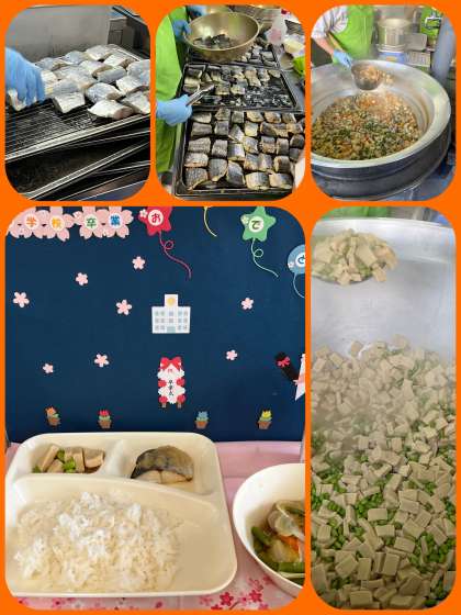 今日の給食献立は、『さごしのおろしじょうゆかけ、さといもと野菜の含め煮、高野どうふの煮もの、ごはん、牛乳』でした。