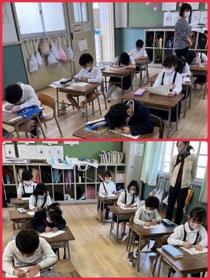 がスタートすると、みんなすらすらと書いていきます。すばらしい!この1年間、いや漢字は半年ほどですが、コツコツと取り組んできた成果があらわれていました。字も丁寧に書けていた人がほとんどでした。全員合格です。わたしもうれしかったです。