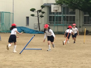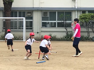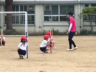 ペアで向かい合い、お互いの棒が立て、倒れる前に、瞬間移動!うまく相手の棒がキャッチすることは、とても難しいようです。でも、相談タイムを大切に、知恵を出し合い協力することで、課題を解決できるペアが増えました。