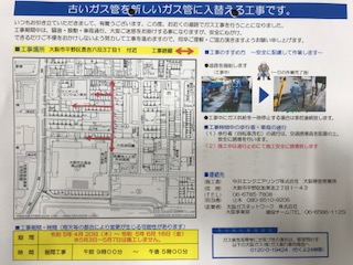 本日4月20日より6月16日まで、本校正門北側の通りにおいて、ガス管取り替え工事が行われます。登校の時間帯は作業時間に重なりません。下校時間には、警備の方が安全確保にあたってくださいます。