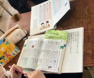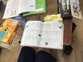 辞書をひいて調べたページに付箋を付けています。付箋には、調べた言葉を記入、自分で学習したことの記録になります。こんなに勉強したんだなぁ、と振り返ることができ、記憶にも残り、さらに自信と励みになります。デジタル化が進む世の中ですが、書物からの学びの良さもたくさんあります。いろいろな方法で学ぶ力を高めたいですね。写真は5年の学びです。