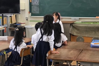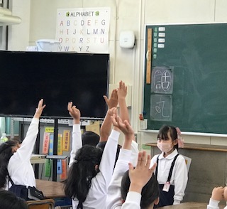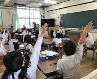 ゴールデンウィーク中の思い出や楽しかったことを発表しています。よく話をきいて、質問もたくさんしていました。「次に発表したい人は?」と聞かれたら、指先までピンと伸ばした手が、たくさんあがります。話し合いのマナーを守り、楽しく交流していました。