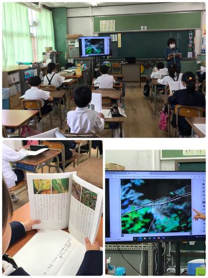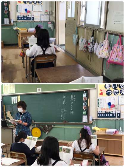 国語で保護色について書かれた説明文の学習です。教科書を音読、モニターや写真で内容の確認をしています。机を整えて姿勢をよくすると、すっきりして学びが進みますね。