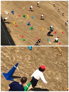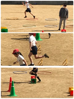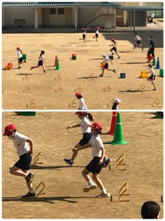 さまざまな道具を使って、跳ぶこと走ることを組み合わせた運動です。よい天気の中、とても楽しそうですね。この動きが、ハードルの学習につながっていきます。