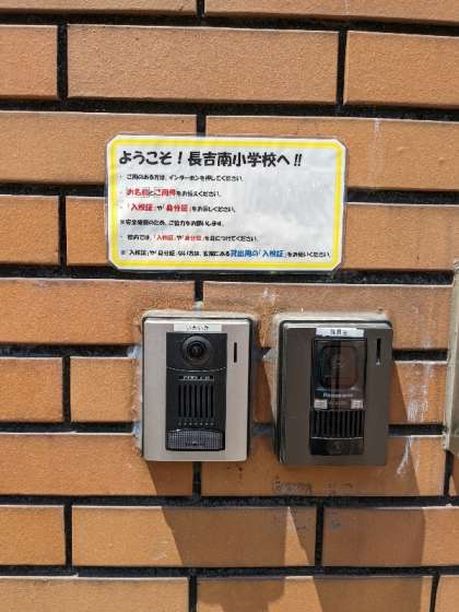 学校では子ども達の安全を守るために、来校者全員に、インターホンにてお名前とご用件を伝えていただくことと同時に、入校証のご提示・校内での常時着用をお願いしています。