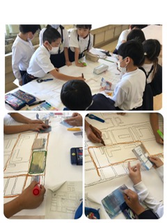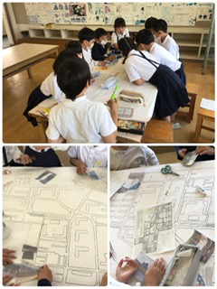 校区探検で見つけた町の様子から、チームでオリジナルの校区地図を作っています。みんなで話し合い、誰にも分かりやすい地図になるよう一生懸命でした。学んだことをさらに情報として発信する活動は、学びの活かしであり、成就感を体験できるものです。地域を愛する気持ちにもつながります。校区マップの完成が楽しみですね。