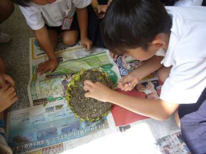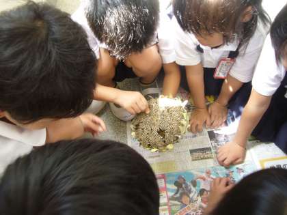 生活科の学習で、夏休みの間に大きくなったひまわりの花をとり、教室前の廊下で種を数えました。子どもたちは、順番に一つひとつ種をむしり取り、100のまとまりを作って見事にすべての種を数えることができました。数えてみると、大きな花では900個以上もの種がありました。一つの種からこんなにたくさんの種ができることを知り、子どもたちも私たちもびっくりしました。