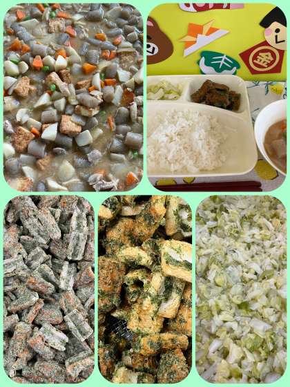 ちくわのいそべあげは、ちくわに青のりを加えた衣をつけ、からっと揚げています。子どもたちにも人気の献立です。