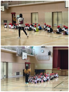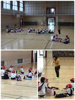 午前中、お勉強を頑張った1年生。お弁当は講堂で遠足気分で食べました。残念ながら、おやつは食べられませんが、遠足気分で友達と楽しいひとときを過ごしました。