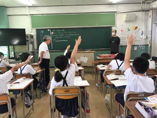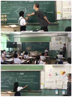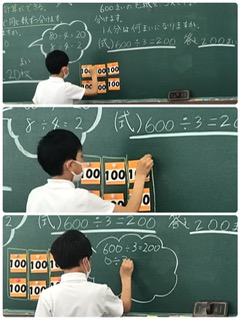 桁がふえても、10や100のまとまりで考えると、一桁のわり算と同じような考え方でできることを学習しています。黒板に考え方を書き、説明につなげています。指先までのばして、しっかり手を挙げています。