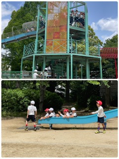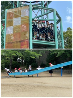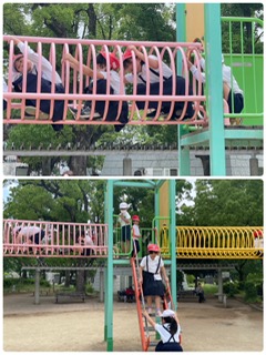 食後は大阪城公園の児童公園で遊んでいます。たくさんの遊具でみんな仲良く楽しそうですね。今日、遠足に行くことができて、本当によかったです。