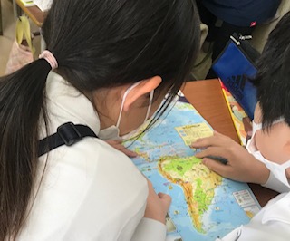 4年は、社会で身近なゴミや廃棄物を通して、環境問題を考えます。自分達の家庭ゴミを調べる体験を通して学ぶので、興味関心が高まります。先日は社会見学で平野焼却工場にも出かけ、処理の仕方を実際に見てきました。最後は、先生からの地図クイズで楽しい時間も過ごしました。言われた国や地名を巻末の索引から探す活動です。地図に楽しく親しめる工夫です。得意な子はとても早く見つけていました。
