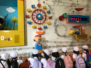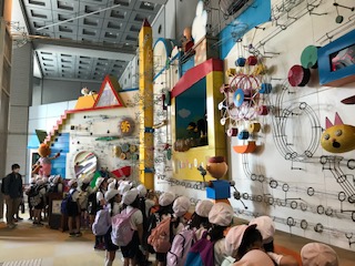 キッズプラザにつきました。入場したら、すぐに大きな動く展示に興味津々でした。館内を回りはじめています。