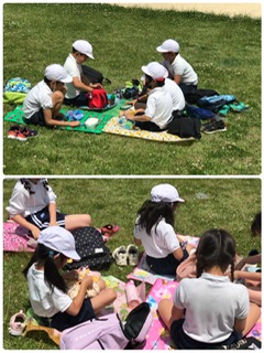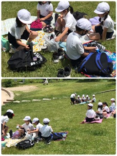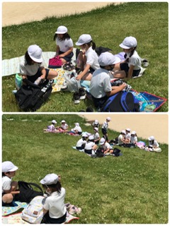 2年 遠足オンライン 芝生の上で、お弁当タイムです!