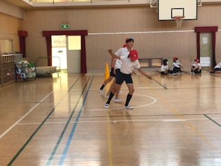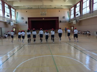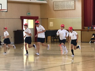 一定のテンポに合わせて、講堂の前と後ろの線を行ったり来たり、何回繰り返せるか?持久力をはかります。初めは楽なのですが繰り返すうちになかなか辛くなってきます。最終走者に見ている仲間からも声援が聞こえます。