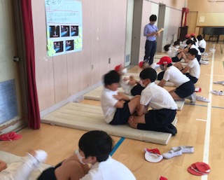 こちらは、仰向けの姿勢から腹筋運動と同じ動きをしています。しっかり体を起こすことが求められます。普段、あまりしなくなった腹筋運動、少しきつい動きかもしれません。が、しっかりできる子もいました。支える側もなかなか力が必要でした。