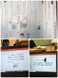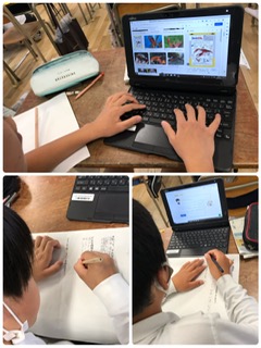 国語の教材をもとに、各自が課題を設定し、調べて報告をつくっています。パワーポイントで、タブレットにプレゼン形式でまとめている児童も見られました。操作に慣れてきています。完成したら、全校で!ぜひ紹介してほしいですね。