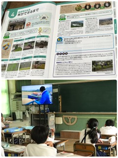 世界の主食となる食材から、日本の米に焦点化し米作りから学びます。話し合い活動で、考えを出し合いました。最後に、稲から、八十八の工程を経て米になることから、米という字ができたことも農家のインタビュー映像で知りました。