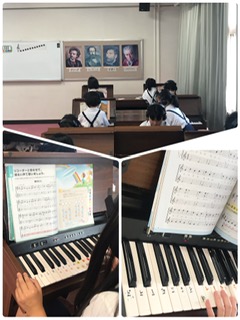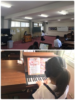 先生の前で一人で歌い、リズムや音程を確認をしてもらいます。自分の番を待つ間、または、終わった人は、オルガンで指練習をしています。ヘッドホンをつけているので、音は外にでません。とても静かな音楽室の様子です。