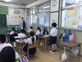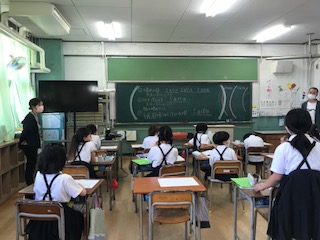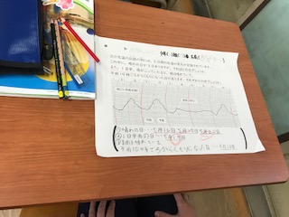 天候と気温の変化を学習しています。実際の測定結果のグラフから、関係を読み取り結論へまとめていきます。曇りの日は、温度変化が少ないことを見つけていました。