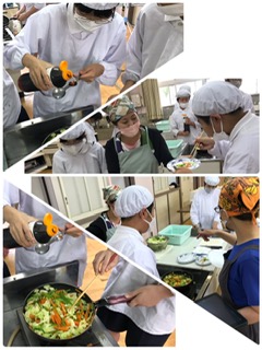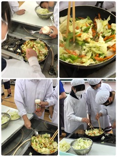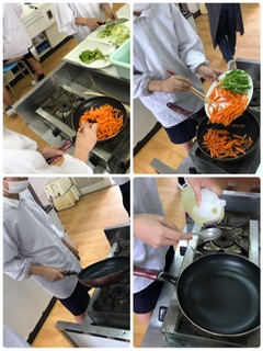フライパンに食物油を垂らし、あたたまれば、にんじん、ピーマン、キャベツの順に炒めます。野菜本来の、炒めた香りを感じて、美味しそう〜、お腹がへったぁ〜、と思わず言葉が出ていました。味見が楽しみな様子で、調味料の加減も班で相談し合っていました。仲良く、楽しい調理の時間でした。