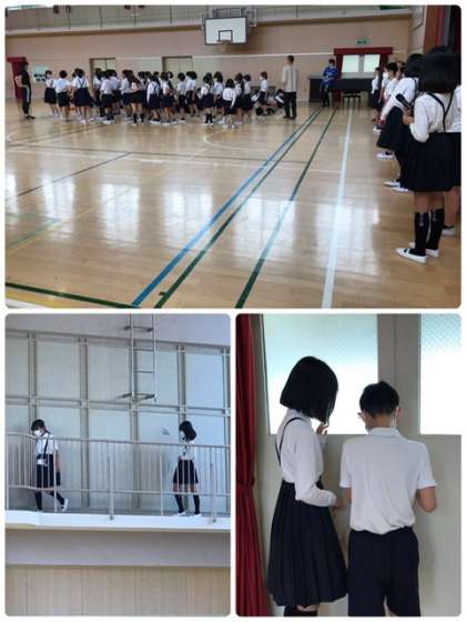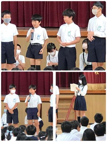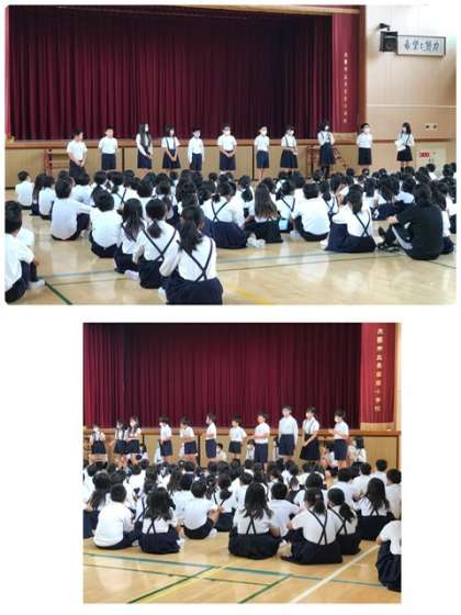 6月1日第1回児童集会で、運営委員会と学級代表の紹介がありました。前に並んで学年、組、名前をしっかりと伝えていました。会場の後片付けもがんばっていました。