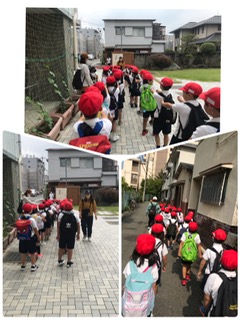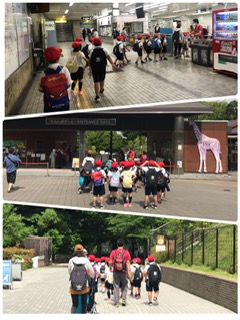 雨で2回延期になった1年の遠足、今日やっと実現しました!待ちきれず、時間より早く教室を出て、玄関で待っていました。道歩き、電車の乗り降り、あいさつなど、ルールやマナーも学んでいます。