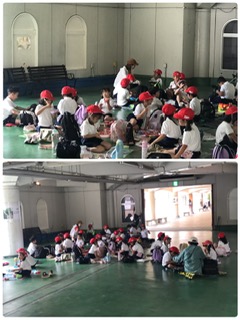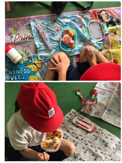 ちょっと疲れたかな?お弁当タイムで、エネルギーチャージです。ご用意いただいたお弁当に、みんなニコニコ笑顔です。広々としたピロティーで食べています。おやつも楽しみです。