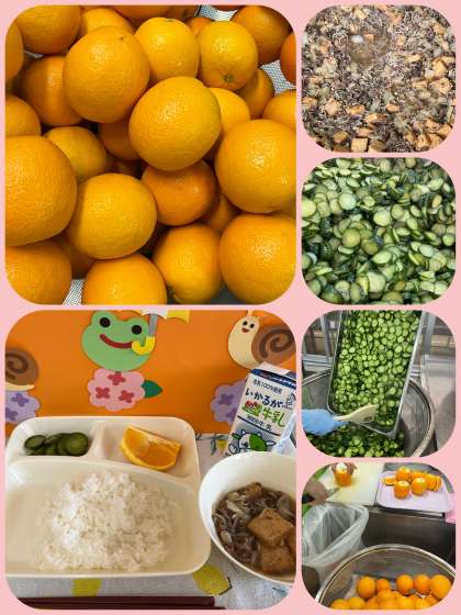 すき焼き煮 きゅうりのしょうがづけ オレンジ ごはん 牛乳