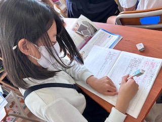 自分の生活体験から、相手を説得するための効果的な工夫や気をつけることを考える学習です。子ども達の意欲が高まる題材で、積極的に考え話し合う姿が見られました。より上手に説明できるよう学習を深めてほしいです。