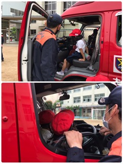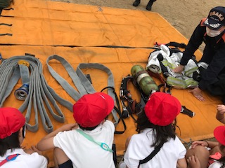 普段は乗れない消防車に乗りました!道具もたくさん見せていただきました。ワクワク、ドキドキ。嬉しそうに、運転席でにっこりする子ども達でした。