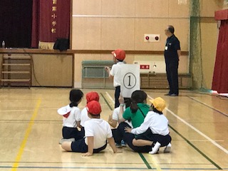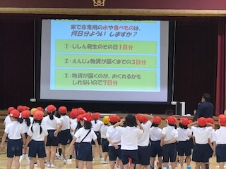 低学年は、区役所の方からクイズ形式でゲームをしながら、防災について楽しく学びました。