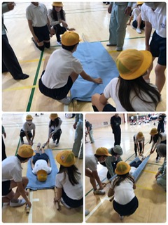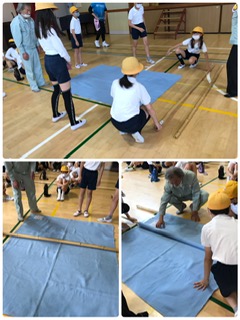棒と毛布で素早く担架をつくります。かなり丈夫な担架ができました!